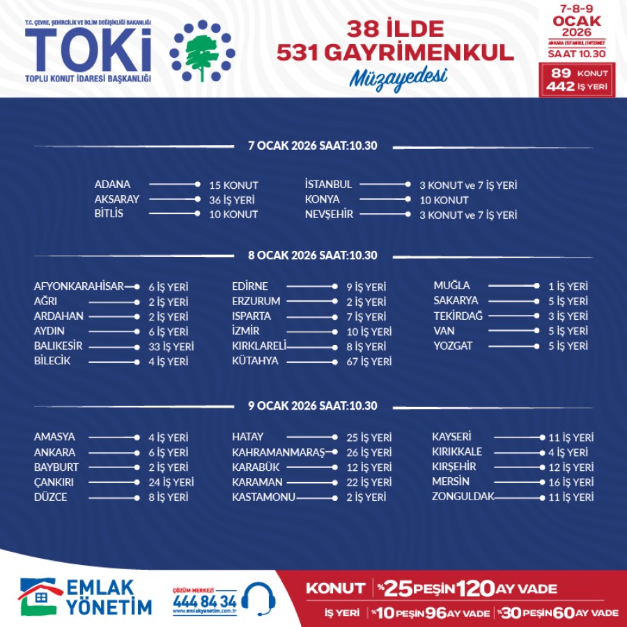 7-8-9 Ocak 2026 Tarihinde TOKİ, 38 İlde 531 Gayrimenkul Satışa Sunacaktır.