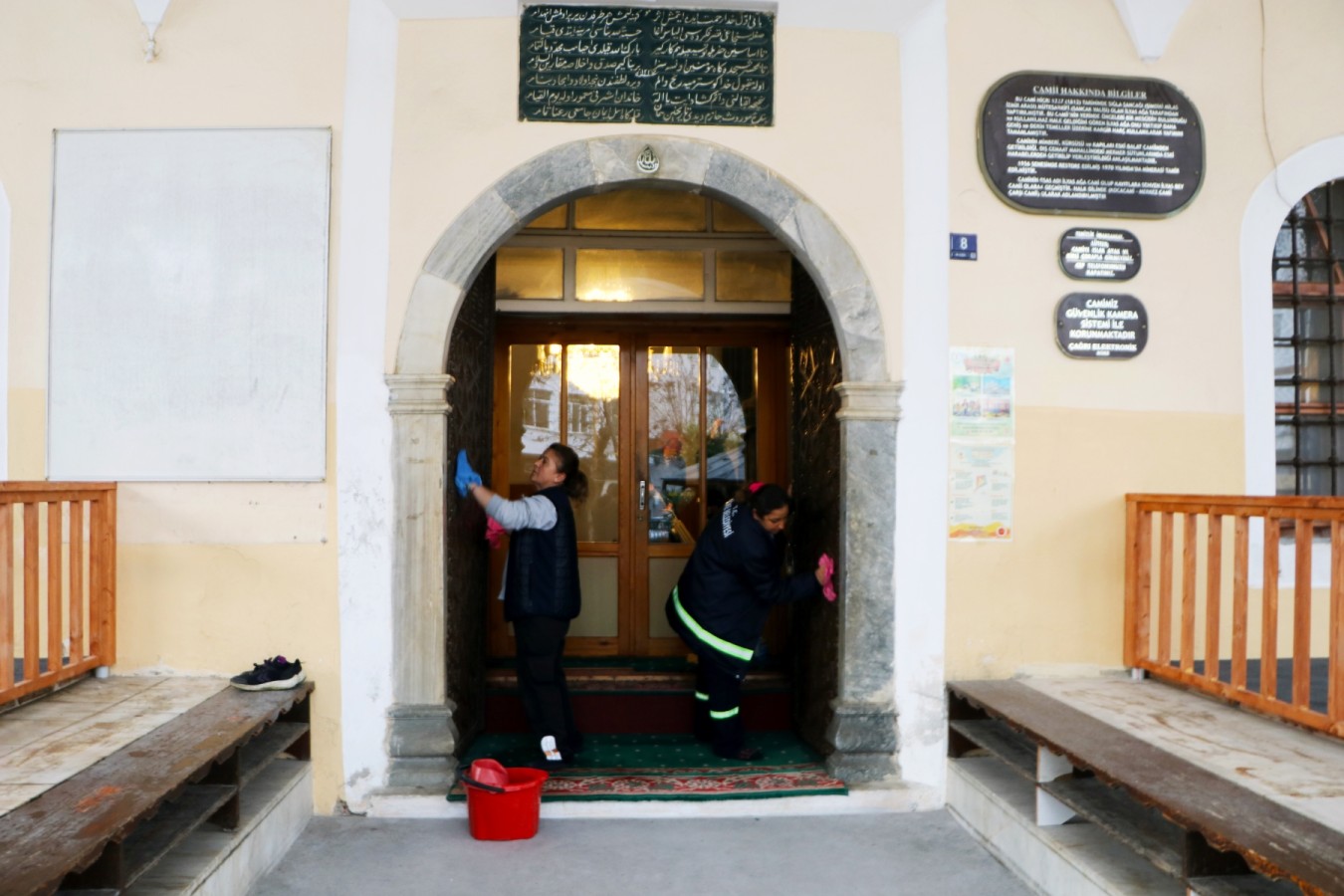 Ekipler tarafından cami içi ve çevresinde genel temizlik yapılırken; halılar süpürülüp, camlar siliniyor, bahçe bölümlerinde şadırvan alanlarında da temizlik uygulamaları gerçekleştiriliyor.