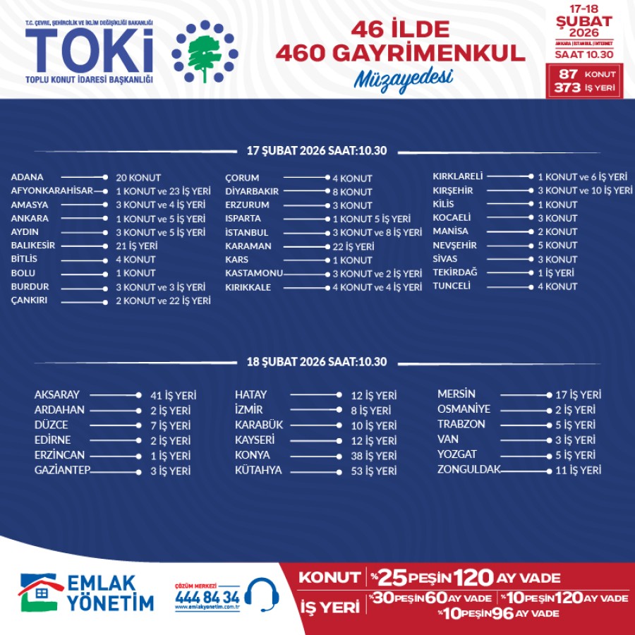 17-18 Şubat 2026 46 İlde 460 Gayrimenkul Satışı Müzayedesi